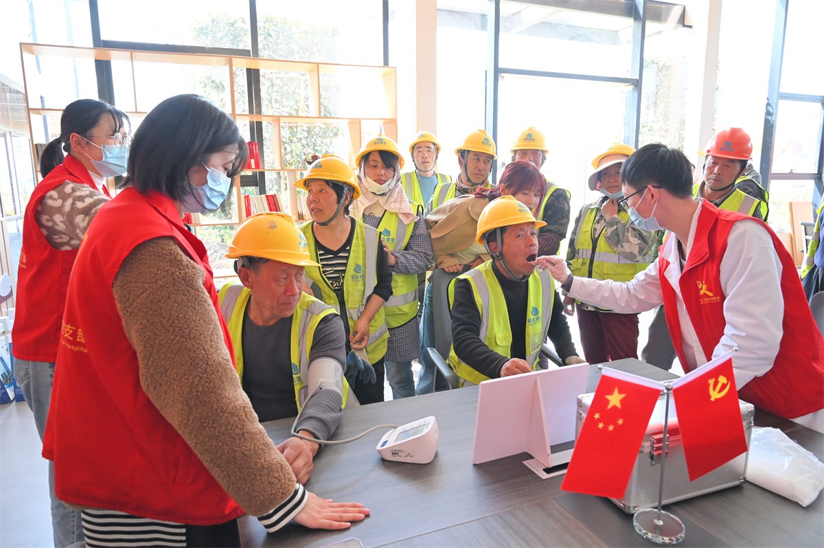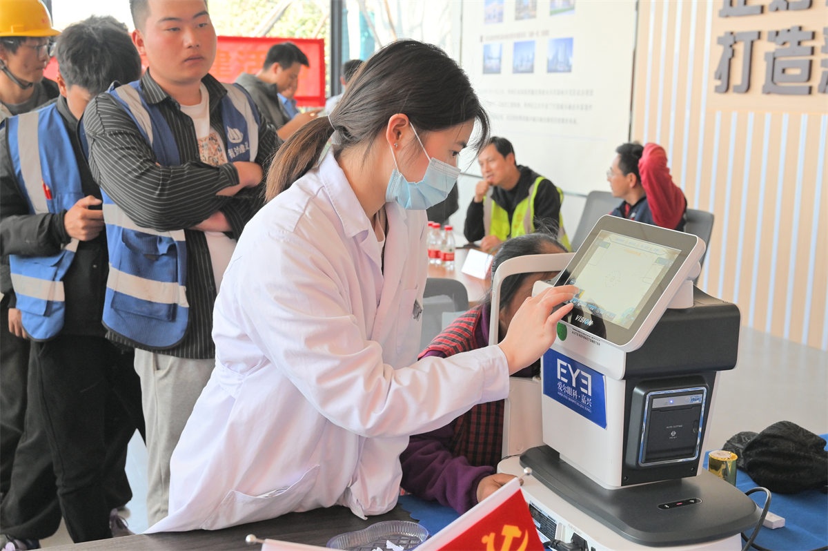 工人付超早早地拉著老鄉(xiāng)趕來,一同檢查了眼睛、口腔、測量了血壓等免費(fèi)義診,由衷地豎起了大拇指,表示這還是他第一次享受到工地上的福利檢查,很不錯(cuò)。